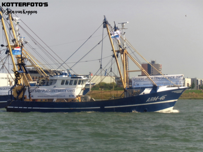 Op de foto ligt de ARM-25 in het blauw voor de kant in Vlissingen. Het kottertje vist af en toe op de Westerschelde met de boomkortuigen op platvis.